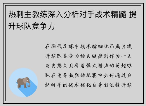 在现代足球中,战术精细化已成为提升球队竞争力的关键。热刺作为一支历史悠久且有着强大潜力的英超球队,在竞争激烈的联赛中,如何通过分析对手的战术,优化自身打法,提升球队的整体实力,是一个持续探索和发展的过程。本文将深入探讨热刺主教练如何通过分析对手的战术精髓,针对性地调整自身战术,提高球队竞争力。从战术分析的角度,本文将从四个方面进行详细阐述:首先是对对手战术特点的深入剖析,其次是如何有效利用这些分析来调整热刺的进攻策略,第三部分则是防守策略的优化,最后将探讨如何通过细节管理提升球队的整体执行力。通过这些分析,热刺可以更好地在激烈的比赛中占据优势,提升球队的竞技水平。
